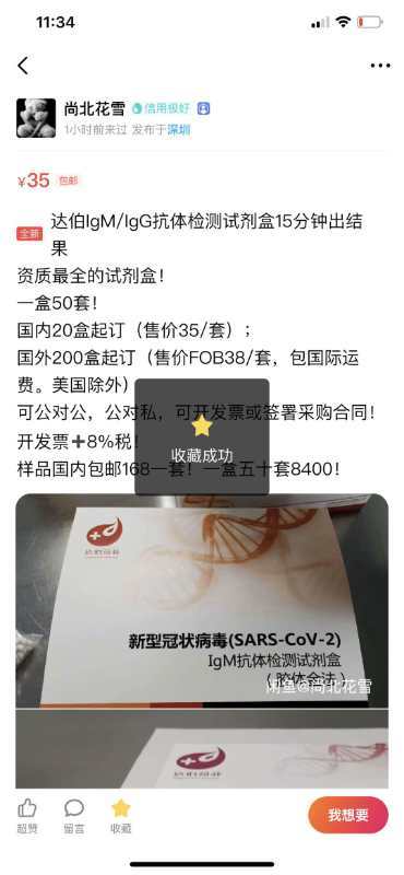 闲鱼卖家“尚北花雪”售卖的“新冠病毒检测试剂盒”,在渠道挂出的产品名称为“达伯IgM/IgG抗体检测试剂盒15分钟出成果”。该卖家称,这是一套“资质最全的试剂盒”,一盒50套,每套35元,国内20盒起订,国外200盒起订。