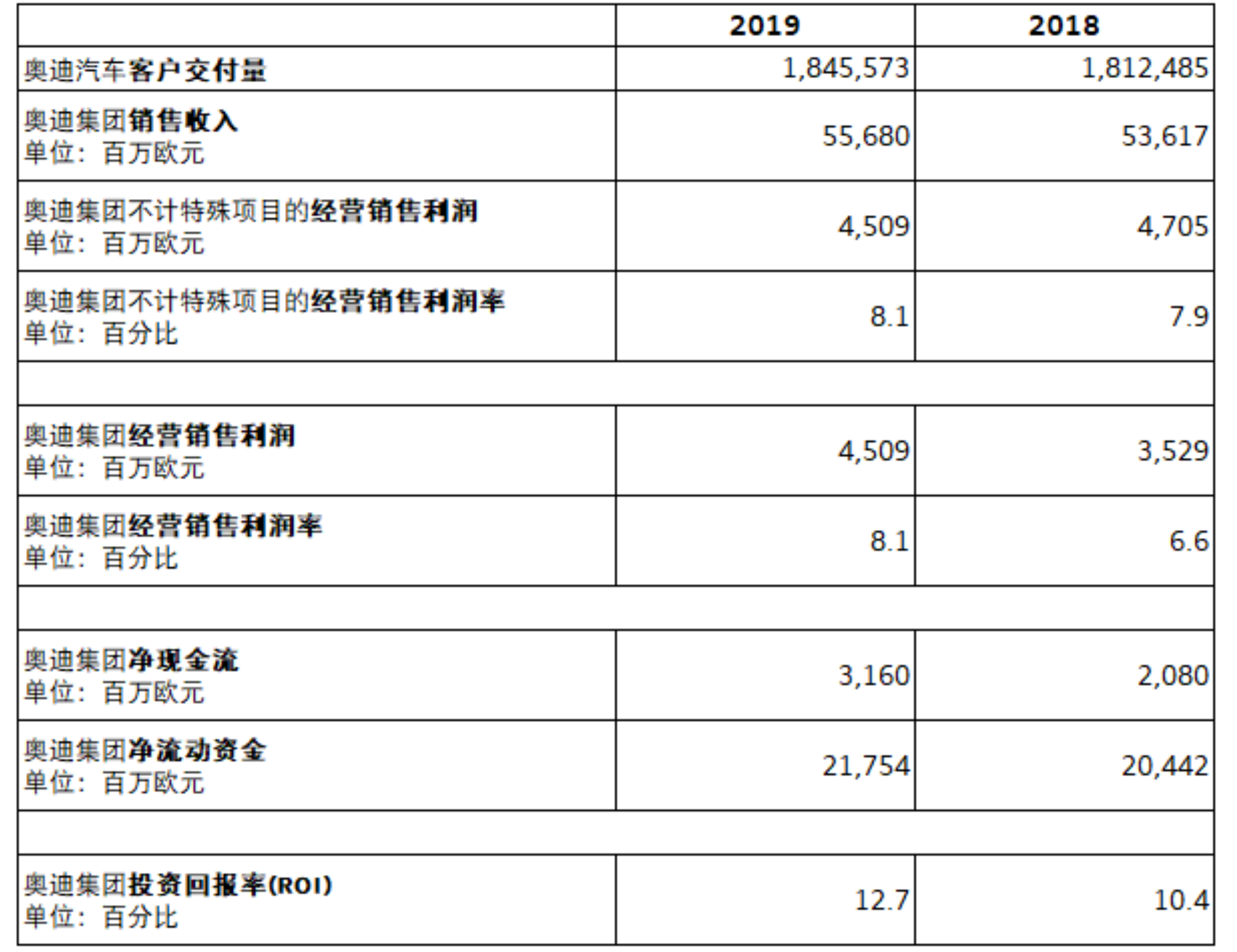 奥迪2019年运营赢利45亿欧元,运营出售回报率8.1%