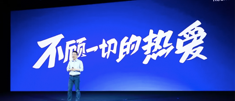 雷军在演讲时,背面的ppt切换到“存亡看淡,不服就干”