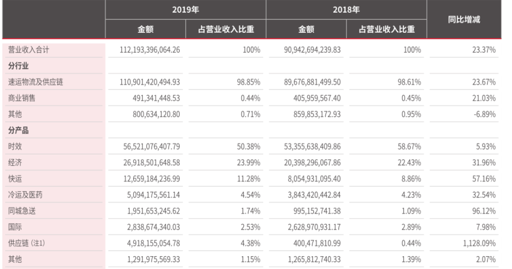 年报多个方面数据显示,2019年顺丰控股时效件业务实现营业收入565.21亿元,同比增长5.93%,在公司中的收入占比由2018年的58.67%下滑为50.38%,但仍为顺丰控股的基本盘。