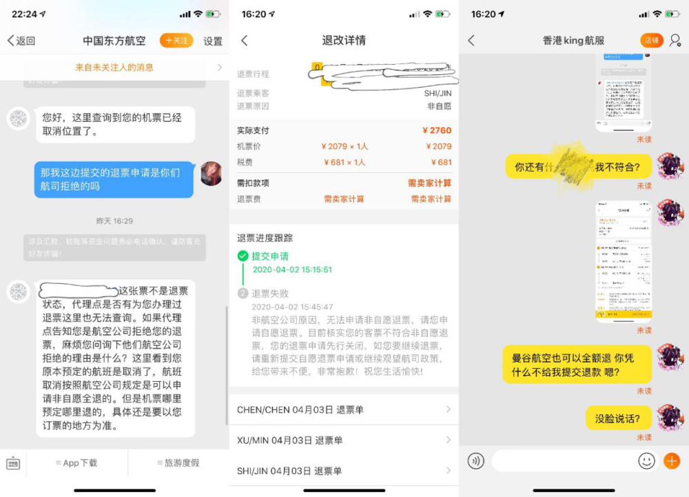 据飞猪用户张兰(化名)泄漏,其于3月8日在飞猪渠道购买了普吉岛飞上海(中转曼谷)的机票,据张兰与中国东方航空公司的交流内容来看,其本来预订的航班现已撤销,这种状况下依照航空公司的规矩可请求非自愿全退款。